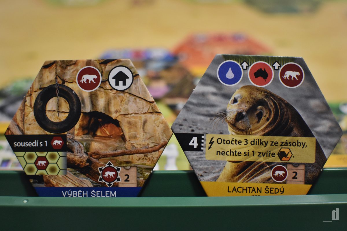 Každý dílek na sobě nese několik ikonek a symbolů a někdy je jich víc než dost. Ve chvíli, kdy je vaše zoo už plná zvířat, začíná být docela problém se v tom všem zorientovat. Máte tady označené bonusy za páry stejného zvířete, šipky, které ukazují, že zvíře potřebuje rozšířit výběh o pole volné plochy, dále na dílcích mohou být uvedeny podmínky pro jejich vyložení do zoo a také na nich najdete až tři symboly, které odkazují na biotop, kontinent a kategorii zvířete. Během první partie jsem měl pocit, že se mi z toho zatočí hlava. Ale nebojte, ikonky jsou naštěstí velmi přehledně rozmístěné a poměrně jednoznačné, což velmi rychle zjistíte.