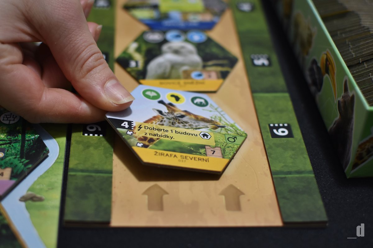 Spousta herních principů je tady přebrána a nějakým způsobem upravena, aby byla hra přístupnější. Neřekl bych ale, že je jednodušší a už vůbec ne lepší. Nebudu ale předbíhat a zpátky k našemu tahu. Po dobrání dílku zoo vás čeká další povinný krok a to provedení akce ze zvolené karty. Můžete provést dobrání dílku zvířete/projektu, nebo vyložení dílku zvířete/projektu na vaši desku zoo. Tímto způsobem se před vámi pak bude rozvíjet vaše zoologická zahrada se všemi možnými výběhy zvířat a také dalšími stavbami.