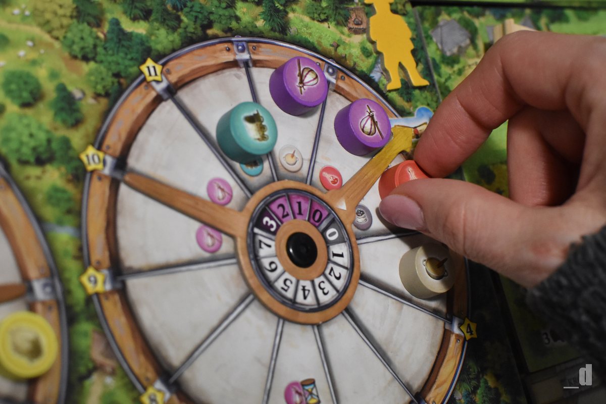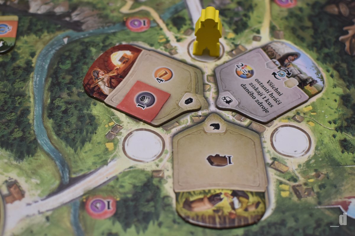 Tímto "panáčkem" se pak budete ve svém tahu moci pohybovat po herní desce, mezi jednotlivými vesnicemi, jejich částmi a později zamířit i na políčka obsahující některou ze zakázek. V jednotlivých vesnicích následně navštěvujete řemeslníky, kteří jsou prezentováni destičkami. Tohle je jeden z hlavních způsobů, jak získat nebo směnit některé suroviny a tím ideálně dosáhnout i produkce. Ta nastane ve chvíli, kdy se na některé ze dvou kol na produkční desce vyprázdní políčka na úrovních 3 (v malé sekci) a 0 (ve velké sekci). Velmi zajímavý mechanizmus mě nejprve mátl, pak jsem si na něj zvykl a s postupem času jsem si tenhle originální způsob produkce dokonce zamiloval a pokaždé když došlo k produkci, si otáčení ciferníku všichni hráči u stolu užívali.