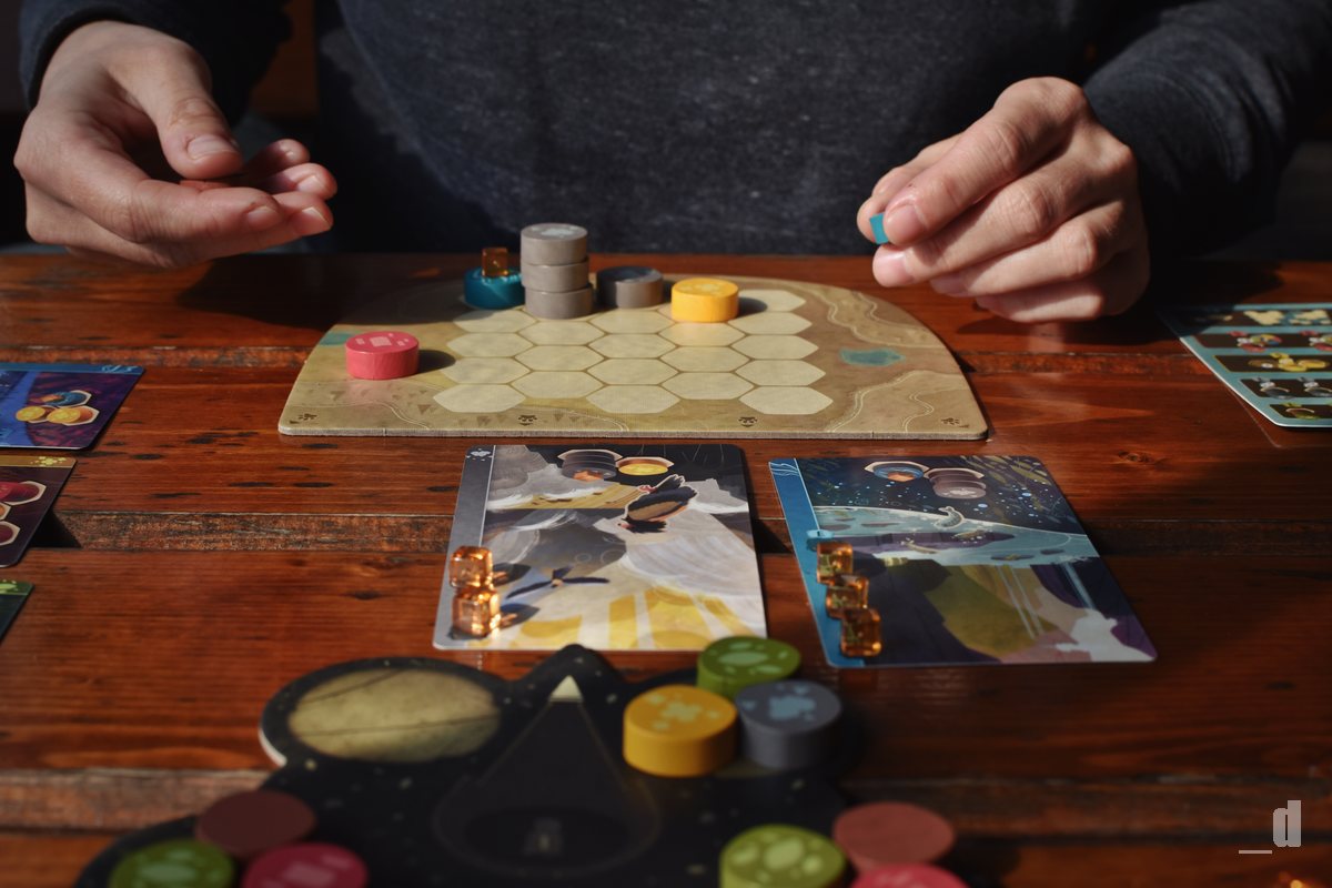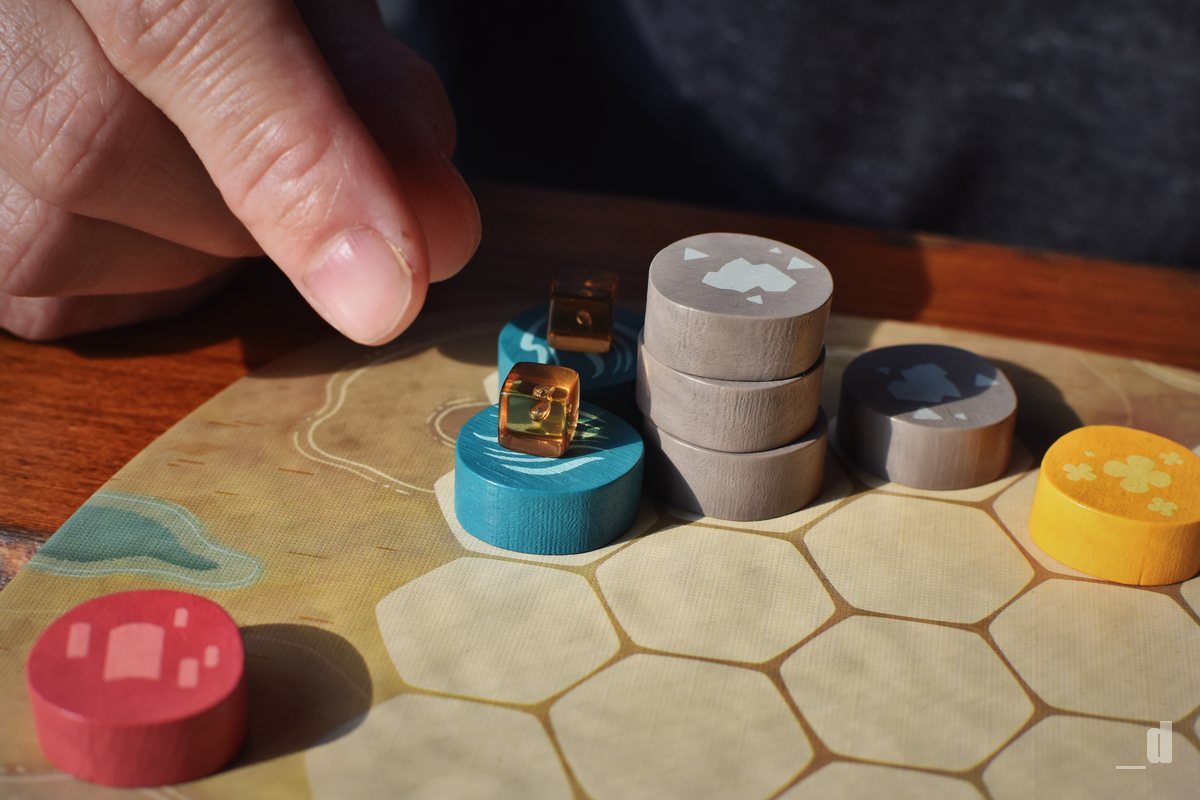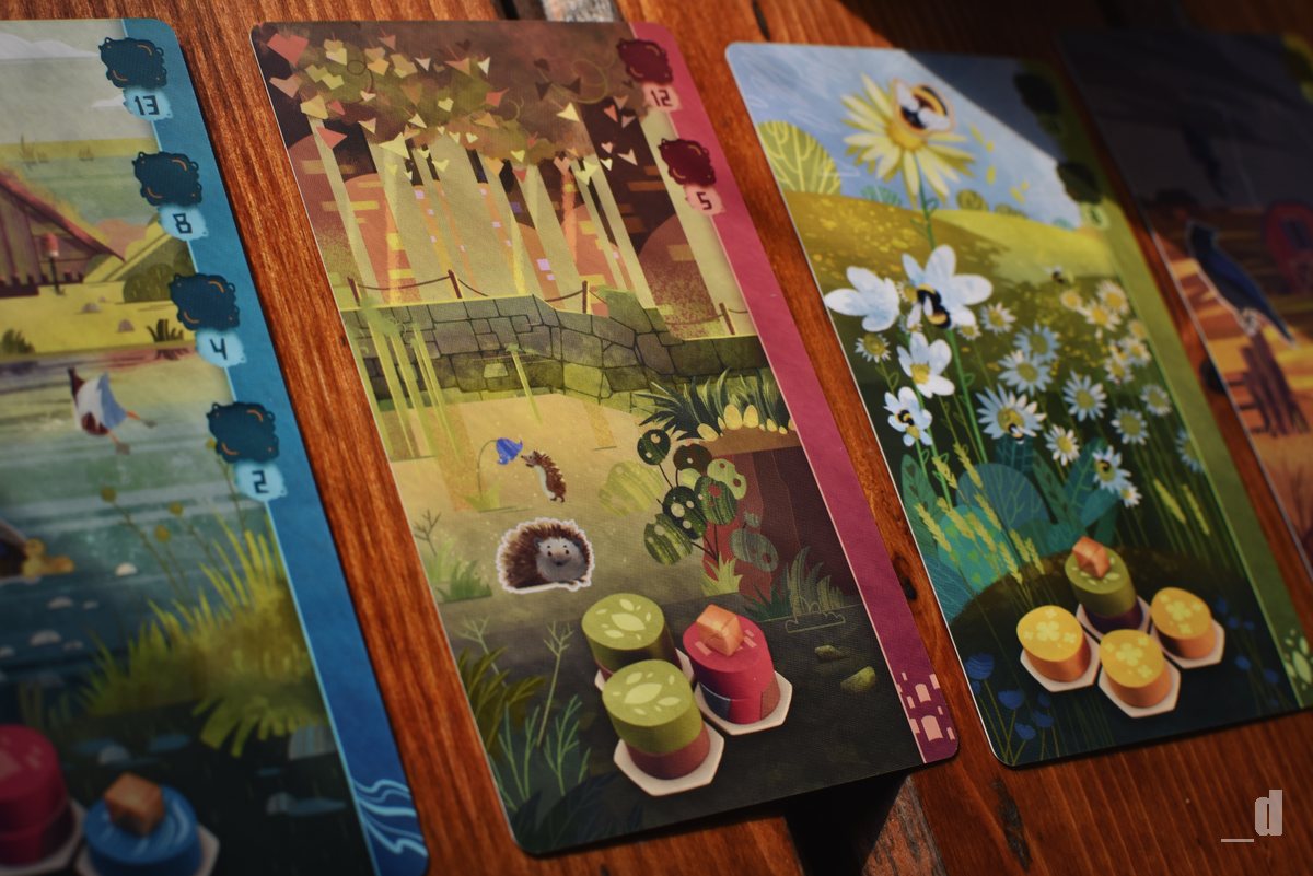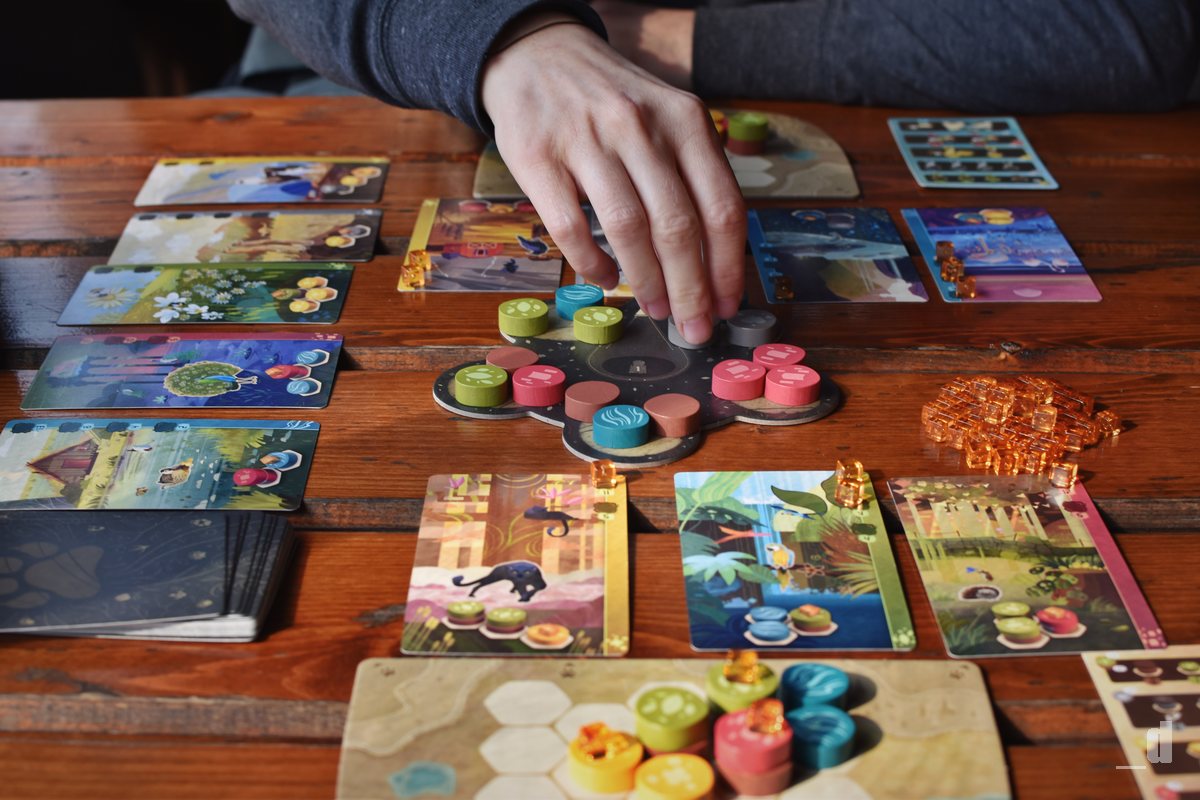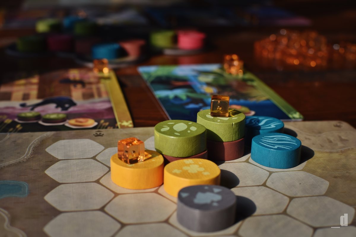 A co že to na své herní desce pomocí dřevěných žetonů skládáte? Kromě umístění žetonů si ještě smíte dobrat jednu kartu z nabídky. Tato karta obsahuje úkol (biotop) v podobě formace žetonů, kterou musíte poskládat na vaší desce. Po splnění takového úkolu si z karty odeberete jednu jantarovou kostičku zvířat a umístíte ji na hotový biotop. Takové karty před sebou můžete mít pouze čtyři a teprve až po odebrání všech kostiček kartu odkládáte stranou jako splněnou a můžete její místo nahradit novou. Vše je pak opravdu velmi jednoduché a intuitivní.