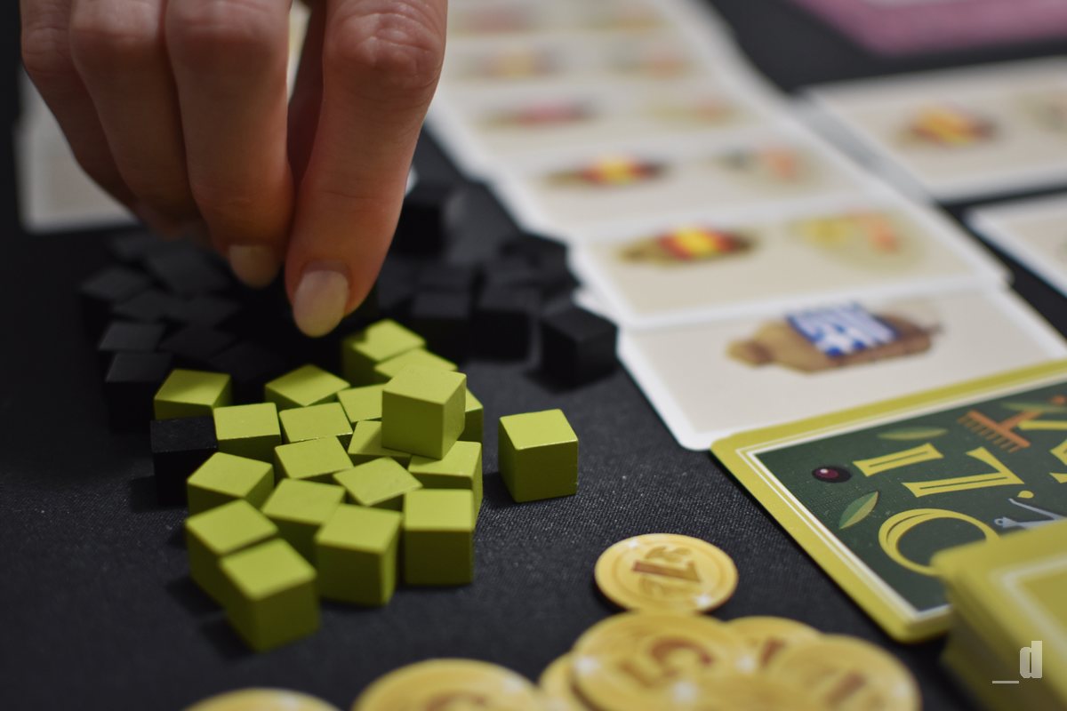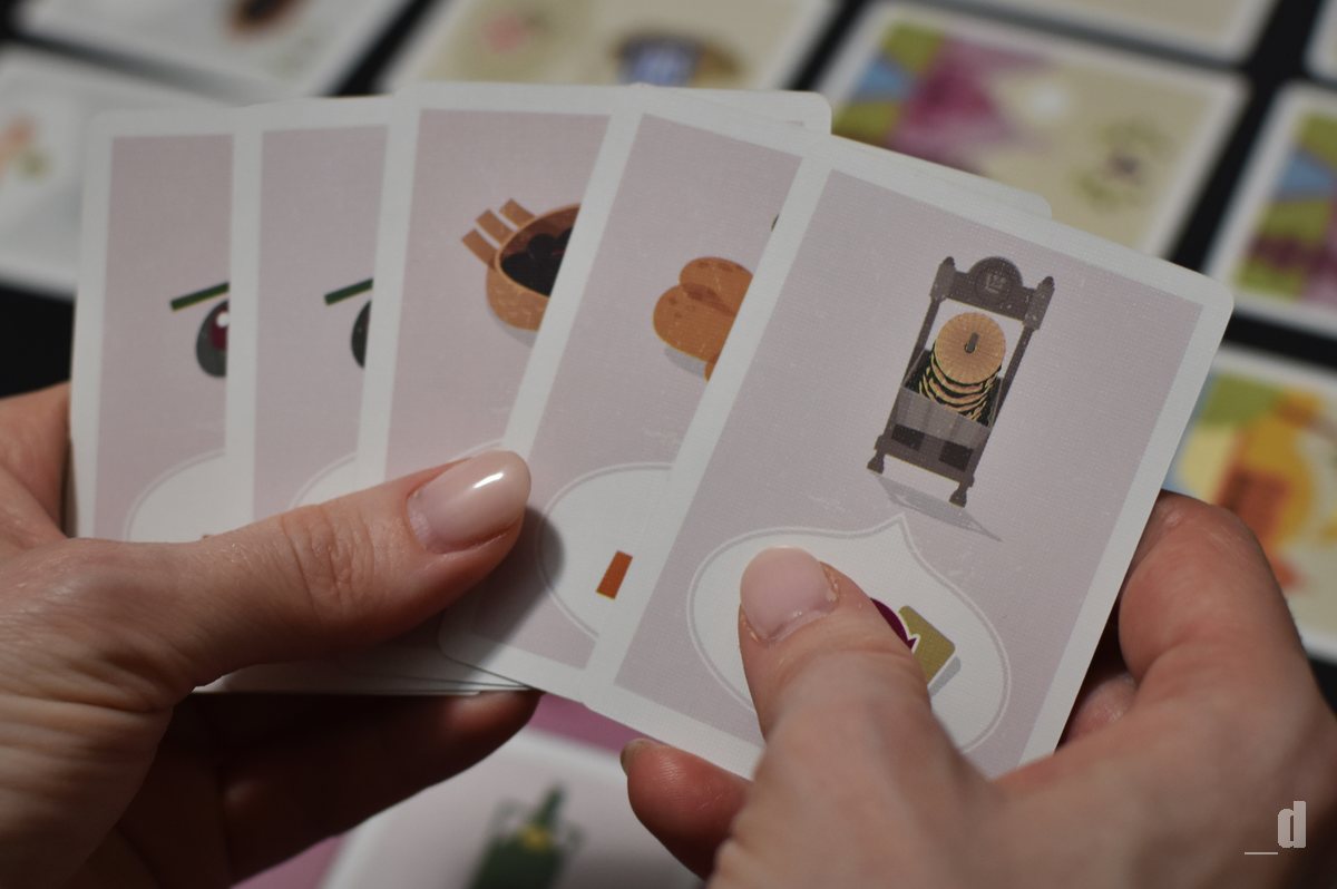 Počet herních kol je závislý na počtu hráčů a každé kolo se pak skládá z několika cyklů a jejich počet se také odvíjí od toho, kolik se vás sešlo u stolu. Ve svém tahu v rámci cyklu pak odkrýváte jednu z dvou předem vyložených karet a následně provedete akci. Můžete se například rozhodnout pro sklizeň a díky tomu získat jednu kostičku olivy plus další kostičky za každou vyloženou kartu se stejným symbolem u vás i u všech soupeřů. Zmiňoval jsem sice dvě vyložené karty, ale na desce jsou čtyři pozice, protože vám na ní zůstávají vyložené další dvě karty z předchozího cyklu. Takže takový… Jak to jen nazvat… Hybridní engine building? Možná mě někdy napadne lepší označení.