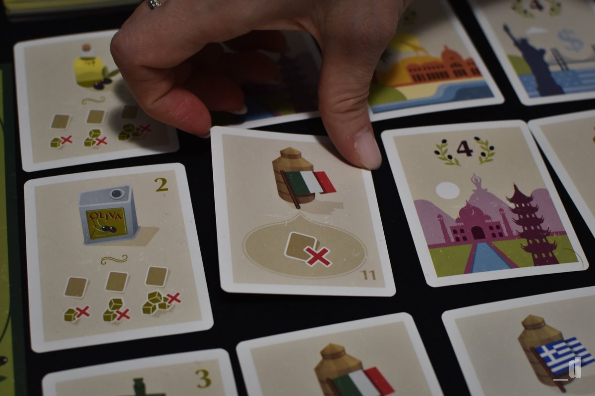 Ale konkrétně tenhle prvek mě baví nejvíce, protože představuje velmi silnou interakci mezi hráči, jakmile zahrajete nějakou akci, posilujete tím stejné akce vašich soupeřů a obráceně. Kromě sklizně můžete lisovat olivy a získávat tak jednu zelenou kostičku oleje za dvě černé olivy. Akce provize zase jednoduše poslouží k zisku mincí. Abych se mohl rozepsat o další akci na kartách, což je prodej (kterému po celou dobu říkáme nákup), měl bych asi nejprve zmínit trh, což je nabídka vyložených karet uprostřed stolu. Tři horní řady představují olivový olej v prémiových lahvích, plechových nádobách a jako třetí pak velká balení. Nakupovat v nich můžete za kostičky olivového oleje a získat tak karty globálních trhů s vítěznými body. Případně si můžete koupit karty národních trhů, ty se na konci partie také budou bodovat, ale jen pokud budou mezi vyloženými kartami národních bonusů (slouží i jako počítadla kol) karty stejného typu, tedy s vlajkou dané země.