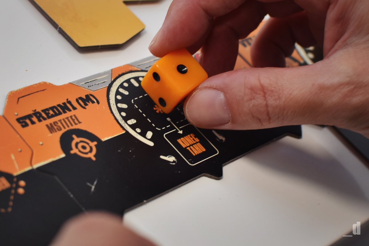 Pomocí předem hozených kostek pohybu si tedy ve svém tahu zvolíte, které auto aktivujete k jízdě a následně ho posunete o daný počet polí směrem kupředu. Ideálně tak, abyste se vyhnuli nastraženým překážkám. Před každým kolem první hráč navíc hodí kostkou silnice a o její hodnotu si vaši jízdu můžete prodloužit, tedy pokud váš pohyb probíhal právě po silnici. Ale ať počítám, jak počítám, máme tady tři auta a čtyři kostky? Ano, ještě máte k dispozici zmiňovanou desku příkazů, kterou můžete využít jednou za kolo a s její pomocí například využít váš vrtulník a pokusit se pokropit soupeře sprškou nábojů a nebo ještě zvýšit počet pohybů vašeho vozidla. - Všem fanouškům závodních her dobře známé NITRO.