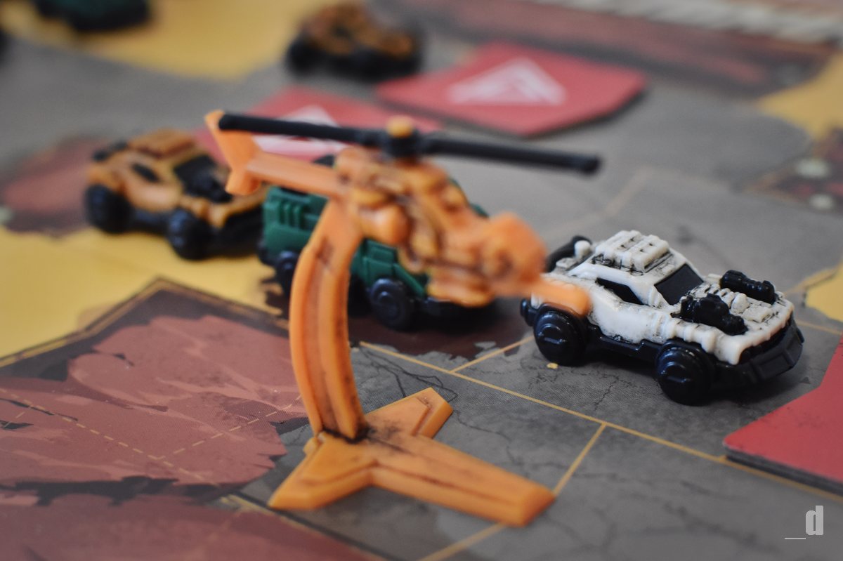Už krabice s krásnou ilustrací na víku ve mně evokuje filmy jako Šílený Max nebo Death Race. A nebudu asi daleko od pravdy, protože pod víkem se skrývá nejen dvanáct detailních modelů autíček, které jako by vypadly z nějakého post-apo dieselového blockbusteru, ale také desky trati, ze kterých si vytvoříte dráhu s co nejdrsnějšími podmínkami k závodění. Celkově mě vizuál hry uchvátil a to bez nadsázky. Modely autíček jsou opravdu stylové a působí jako ty oprýskané káry, které banda zmutovaných desperátů dává dohromady a udržuje pojízdné někde hluboko v poušti. To samé pak platí pro vrtulníky a pozadu nezůstávají ani krásné barevné kostky... Teď jsem z toho nechtěně udělal jakýsi závod komponent, ale v Pekelné jízdě je zkrátka na co koukat.
