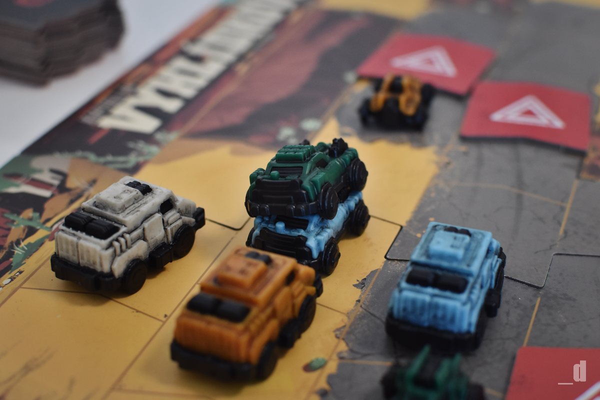 Nejen pohybem živ je postapokalyptický závodník a jednou z možností je i dobrovolná a nebo nevyhnutelná srážka. Ta se vyhodnocuje podobně jako souboje v jiných deskových hrách, tedy pomocí kostek. Kostka srážky určí, které vozidlo to "schytá" a kostka směru rozhodne, kterým směrem se tento nebožák přesune. Ideálně tedy do neprůjezdného pole, nebo pod vrtulník, kde jeho cesta končí. Bouračky se pak můžou pěkně kombit a změnit v hromadnou nehodu, během které dojde k poškození hned několika aut. Aby toho nebylo málo, na auto před vámi můžete dokonce vystřelit. Tady často nastane i neplánovaná kooperace a vzniknou krátkodobá spojenectví mezi hráči. Tohle ale nemůže trvat věčně, protože projet jako první cílem může jen jeden. I když, druhá z možností, jak hru vyhrát, je zůstat alespoň s jedním autem na trati jako poslední.