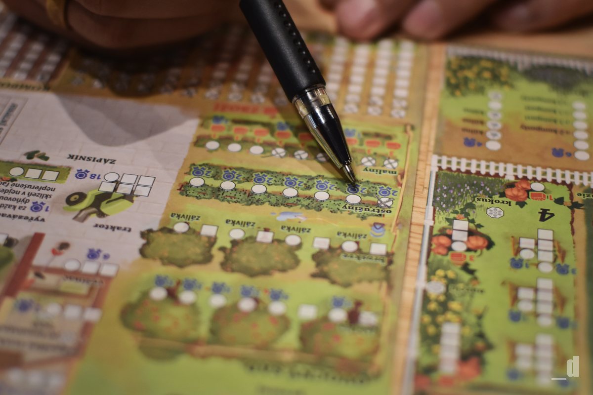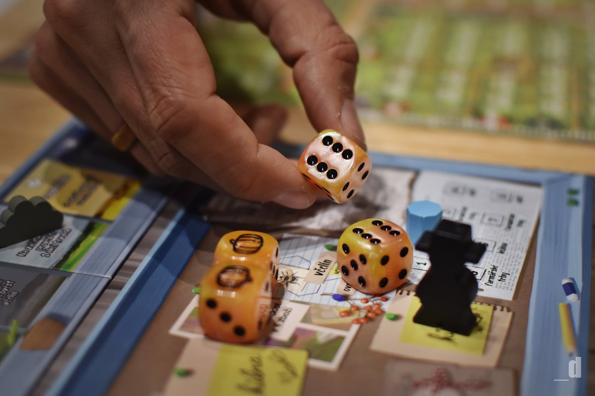 A co dál? Vybrali jste si postupně jednotlivé kostky, zakreslili křížky do vašich listů představující zahrádku, kůlnu, ovocný sad a včelín a můžeme pokračovat dalším kolem. Tak to ani náhodou! Protože ještě navíc každý z hráčů může provést akce kostky s nejnižší hodnotou, kterou si nikdo nevybral. Tomu říkám opravdu velké množství akcí, které proběhnou v jednom herním kole a já stále nekončím. Konec kola totiž ještě doprovází událost, která například může přinést déšť a na zahrádkách všech hráčů nechat povyrůst všechny vaše plodiny, nebo třeba znovu vyvolat farmářské trhy.