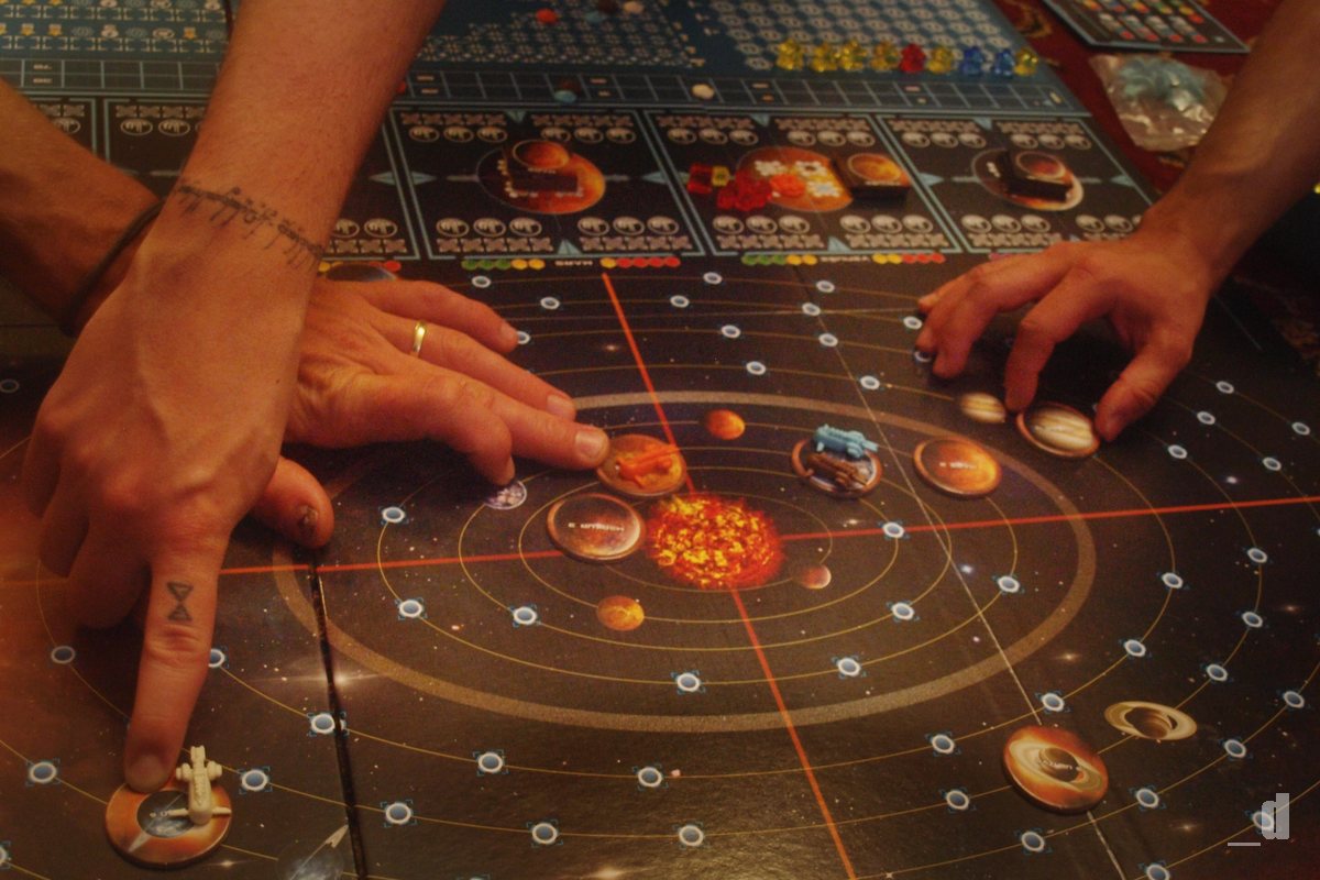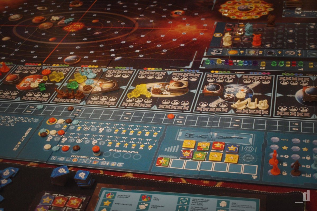 Koberec je vysátý, na něm leží rozložená herní deska osázená planetami sluneční soustavy, žetony hráčů, sondami, žetony sluneční aktivity, planetárními akcemi a tak dále a okolo této sestavy je ještě spousta dalších herních prvků jak společných, tak jednotlivých hráčů. Na společnou zásobu surovin a lidí si ještě připravte vlastní nádoby. První hráč bude ten, kdo byl naposledy ve vesmíru… My jsme tam sice minulý týden byli všichni, ale jelikož kolega oproti našim obyčejným konzolím opustil matičku Zemi ve virtuální realitě, přenechali jsme prvenství jemu. Toto privilegium se pak během hry už nemění a rozhodně může přinést určité výhody. Každý hráč se zhostí role lídra jedné velké korporace, která svým počínáním přispívá ke společnému cíli - zachránit lidstvo. Ale nedejte se zmýlit, nejedná se tady o kooperaci, právě naopak. Budete se bít o prestiž, vládu a v přední řadě o suroviny potřebné k postavení vesmírného plavidla Interstellar, které přepraví lidské pokolení v kryogenním spánku do nového domova.