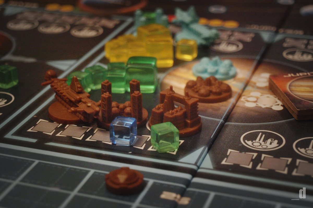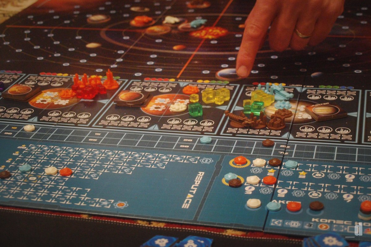 A teď už k herní mechanice. Vysvětlovat podrobně pravidla určitě nemá smysl, i naživo to zabere poměrně dlouhou dobu, takže to jen naťuknu, ať máte představu o složitosti této vesmírné strategie. Každé kolo se skládá ze tří různých fází. V první, akční fázi, ve zkratce budete shánět suroviny a palivo, abyste v další fázi mohli například poslat sondu do vzdálené soustavy Trappist nebo mohli postavit část modulu vesmírné lodi a podobně. Co ale všechno můžete dělat? Abyste mohli těžit suroviny na planetách naší sluneční soustavy, je potřeba vyzkoumat danou technologii, tu přepravit na vámi vybranou planetu transportérem a mít také dostatek paliva, abyste vytěžené suroviny mohli přepravit zpět na zemi. Jak ale získat suroviny na výzkum? Můžete si je například koupit na trhu. Za velmi nevýhodnou cenu. Platidlem je tady palivo, takže jsme u toho, kde získat palivo. Buďto využijete pozemskou produkci, nebo postavíte příslušnou budovu, kterou též musíte vyzkoumat, na vámi obsazené planetě. Nebo - což je zajímavý a nebezpečný herní prvek - můžete využít zmíněnou solární těžbu, která je zároveň ale jistým přiblížením naší zkáze. Meziplanetární cestování je opakovatelná akce, pokud ale poprvé přistanete na některou z planet, ve stejném kole už nevzlétnete. Ono postavit si základnu a vrtnou stanici chvíli trvá, všechno má svá pro a proti.