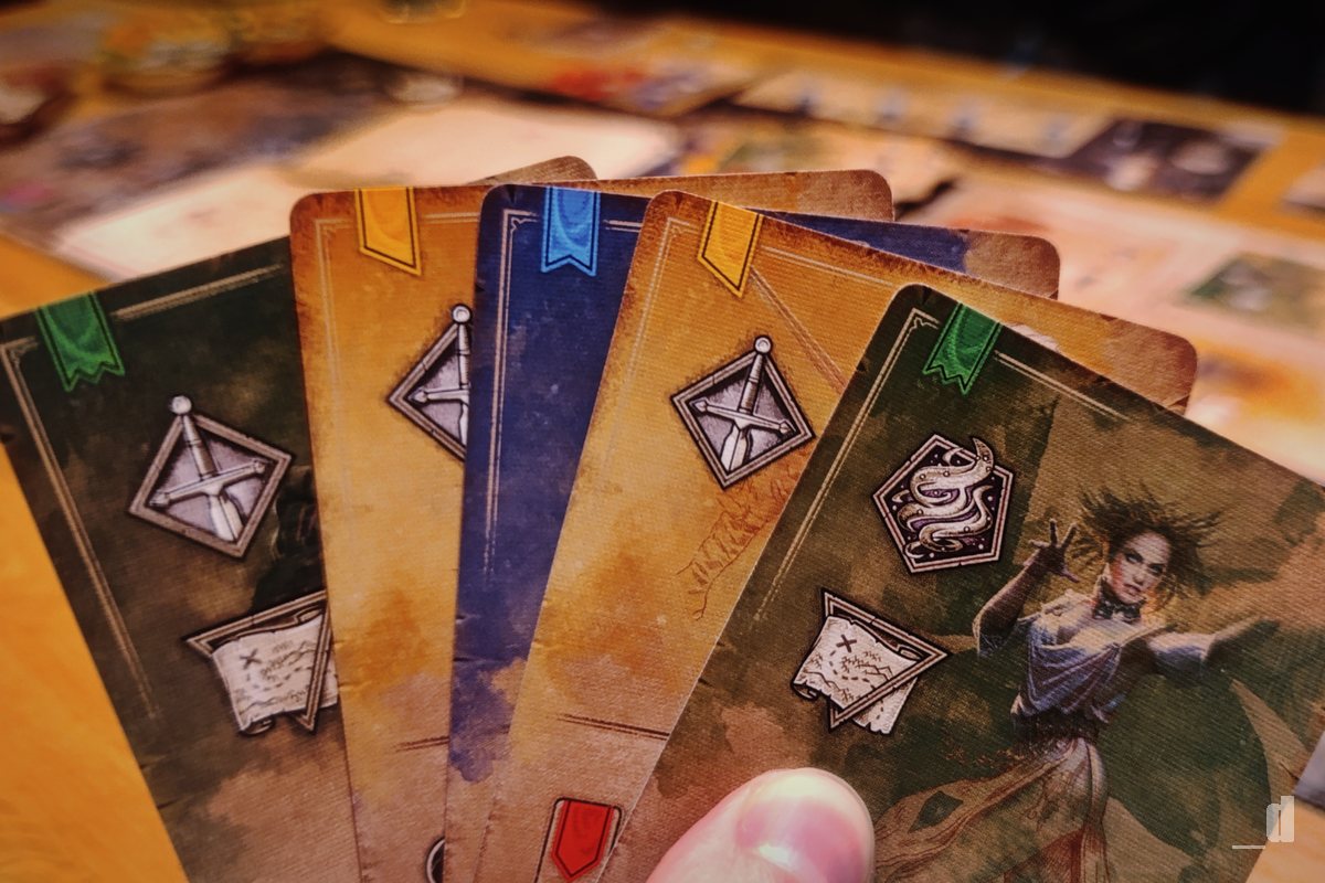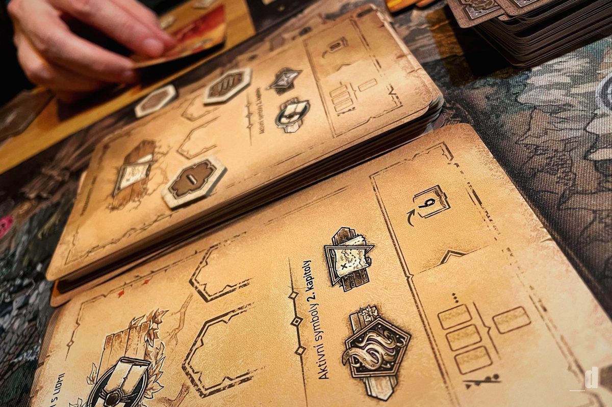 Karty akcí však nenesou pouze symboly. Většina z nich obsahuje také speciální efekty, které se aktivují při splnění určité podmínky a mohou hráče odměnit například dalšími body zkušeností nebo dodatečnými symboly. Během kapitol totiž karty vykládáte vedle sebe do takzvané časové osy. Právě zde se naplno projevuje jeden z klíčových prvků hry, srategické kombinování barev a symbolů mezi kartami na ose, které mohou výrazně ovlivnit váš bodový zisk. Příběh se obvykle uzavírá po třetí kapitole, kdy následuje epilog a závěrečné vyhodnocení bodů, které určí čestného vítěze. Samotné závěrečné dějství pak slouží především jako příběhové rozuzlení.